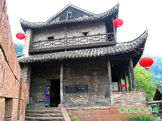 東門城樓始建于清康熙五十四年(1715年),城門下部由紫紅砂巖砌成,上部城樓則用古磚砌筑。城門寬3.5米,高4米,呈半圓拱,兩扇城門都用鐵皮包裹,用圓頭鐵釘密釘,牢實堅固。城墻修筑全部用紅砂條石,精工細鉆,規(guī)格一致,城墻厚0.8米,下部內(nèi)外兩側(cè)用條石加石灰漿砌成,中間填以碎石粘土,層層夯實;頂部的中間填充物改為石灰、鵝卵石、黃土拌成的三合土,厚約0.33米,上面鋪以紅砂塊石。城樓高11米,大門上方有槍眼8孔。歇山屋頂,覆以腰檐,飛檐翹角,精美壯觀。