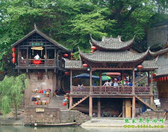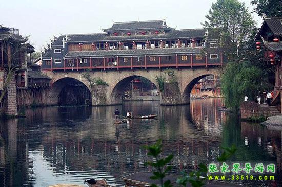 沱江河是古城鳳凰的母親河,她依著城墻緩緩流淌,世世代代哺育著古城兒女。坐上烏蓬船,聽著艄公的號子,看著兩岸已有百年歷史的土家吊腳樓,別有一番韻味。順水而下,穿過虹橋一幅江南水鄉(xiāng)的畫卷便展現(xiàn)于眼前:萬壽宮、萬名塔、奪翠樓……一種遠離塵世的感覺悠然而生。沱江的南岸是古城墻,用紫紅沙石砌成,典雅不失雄偉。城墻有東、北兩座城樓,久經(jīng)滄桑,依然壯觀。