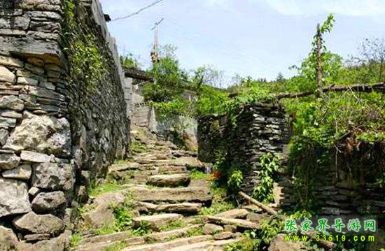 寨前阡陌縱橫,溪流交錯(cuò),九曲迂回,水邊是排排水、石碾,水里是整塊整塊的天然青巖板,出水為洲,入水為瀑,并形成許多奇特階梯瀑,水上是一道道巖板堰,堰上是一道道形態(tài)各異的跳巖,水溝上橫著塊塊巨大的巖板橋……山水田園與水、水碾、巖板堰、巖板橋、跳巖相互輝映,構(gòu)成一幅幅絕妙卷。