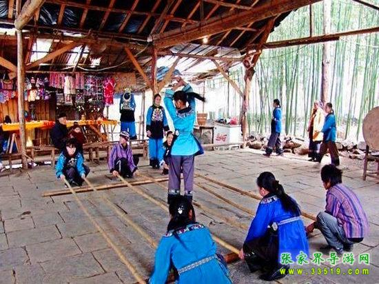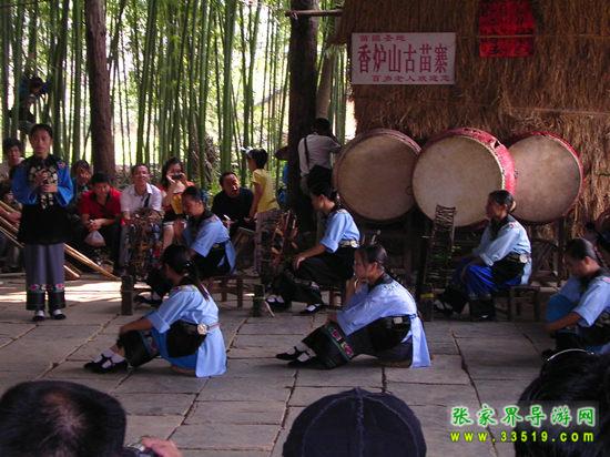 進(jìn)入鳳凰香爐山苗寨必須過三道關(guān):一是去剿匪,二是對山歌,三是喝三碗米酒。如果過不了這三道關(guān),是不能進(jìn)寨子的。剿匪就是過一道山洞(當(dāng)年土匪躲藏的地方),也就是拍攝電影《湘西剿匪記》的現(xiàn)場,洞內(nèi)驚險崎嶇,道路難走,還要過一條河,河面上的橋是用小木板釘成,僅一米寬,上面滴水,橋上很滑,橋下流水很急。