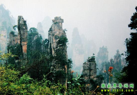 數(shù)以千計的奇峰怪石拔地而起森列谷中。在建筑師看來,石峰如塔、如柱、如屏、如樓、如堡、如墻,鱗次節(jié)比、錯落有致,展現(xiàn)了一幅宏偉的建筑藍(lán)圖;在藝術(shù)家看來,石峰似人、似佛、似鳥、似獸、似花、似樹,似瓊樓玉宇,生動逼真唯妙唯肖,似一幅彩色的畫卷;在軍事家看來,石峰是將、是兵,是鼓、是旗、是車、是馬,威武雄壯嚴(yán)陣待發(fā),象一支天降的軍隊。