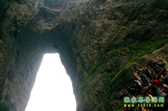 雄偉高大。清人王子睿詩曰:“推得石門開,去天才五尺”。天門洞高131.1米,寬30米,深37米,可容納300人,可修建一董16層高的樓房。清代一 知縣李瑾站在永定衛(wèi)城的上觀望,只見“巖竇半吞清夜月,山阿常宿隔霄云”。此時(shí)的天門洞,把月亮吞去了一半。