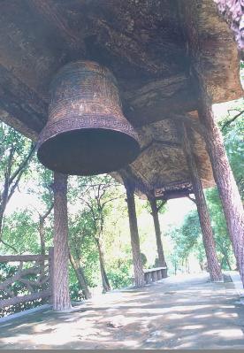 飛來(lái)鐘原為君山崇勝寺的古鐘,南宋淳佑五年(公元 1245 年),荊湖安撫制置使孟珙重修崇勝寺時(shí)復(fù)制一鐘,鐘高一丈多,大數(shù)圍,重4000余斤,上有“淳佑五年造”,鐘身上鑄有“皇帝萬(wàn)歲,國(guó)泰民安,風(fēng)調(diào)雨順,五谷豐登”16 個(gè)大字,四方凸出的部分用青銅澆鑄的四條金龍,栩栩如生,形態(tài)逼真。原鐘在1966 年被砸毀,現(xiàn)在的飛來(lái)鐘是1979 年由市閥門(mén)廠復(fù)制而成,高約2 米,直徑1.2 米,重約 2 噸。鐘身上改鑄著鐘相、楊幺起義的戰(zhàn)斗口號(hào)“均貧富,等貴賤”六字,比前者更富有深刻的含義。這口古鐘有段優(yōu)美的傳說(shuō)。相傳南宋初年,洞庭湖畔數(shù)以十萬(wàn)計(jì)的農(nóng)民在楊幺率領(lǐng)下,掀起了轟轟烈烈的農(nóng)民起義。相傳一天夜晚,朝廷派兵前來(lái)偷襲駐扎在君山的楊幺寨,忽然從天上飛來(lái)一口巨鐘,鐘聲陣陣,催醒義軍,奮起抗敵,因此叫飛來(lái)鐘。這是人們深切懷念楊幺起義軍,用各種方式來(lái)表達(dá)贊美之情。古鐘的傳說(shuō)便寄托了人們的這種心情。有人據(jù)此認(rèn)為,原來(lái)的飛來(lái)鐘系楊幺起義軍所鑄的報(bào)警器。