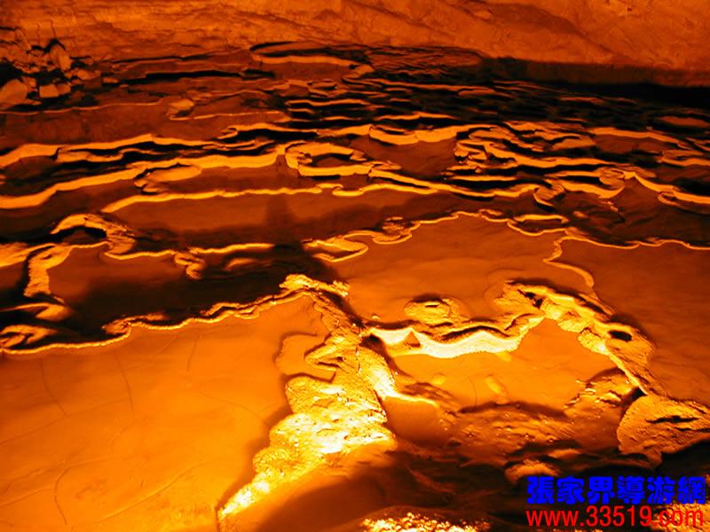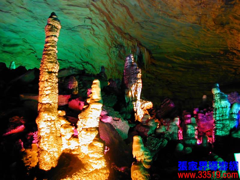 (龍宮)龍宮是黃龍洞十三個(gè)大廳中最大的一個(gè),也是景色最美的景點(diǎn)之一,底面積15000平方米,平均高40米,兩千余根石筍拔地而起,千姿百態(tài),異彩紛呈,或如飛禽走獸,或如宮廷珍藏,有的像巍巍雪松,有的像火箭升空。龍宮后園有金銀兩座花池,清水常溢,花簇盛開。宮頂鐘乳柳垂簾掛,四周壁畫栩栩如生。溶解著各色各樣的礦物質(zhì)的水,從巖層中滲透出來,滴落下來。礦物質(zhì)在洞頂凝固結(jié)晶成倒懸鐘乳石,從鐘乳石滴落的水又把礦物質(zhì)澆疊、堆壘在洞底,而長(zhǎng)成節(jié)節(jié)向上的石筍。大家看看這龍宮的造型,領(lǐng)略這磅礴的氣勢(shì)。洞內(nèi)最大石筍,高12米、直徑10米的漢白玉天然石椅“龍王寶座”居高臨下,眾多石柱石筍似人似物,維妙維肖,圍著寶座朝拜山呼,幾十座珊瑚亭亭玉立,儼然一支龐大的“宮廷樂隊(duì)”。湖南著名教授羊春秋先生作《寄生草》詞對(duì)此進(jìn)行描繪:“百態(tài)千姿模樣,三宮六院門巷。龍王開宴設(shè)瓊漿,猴王偷果鬧天堂,君王納寵擁羅帳。搬演了人間爭(zhēng)攘,匯集了天下奇觀。”