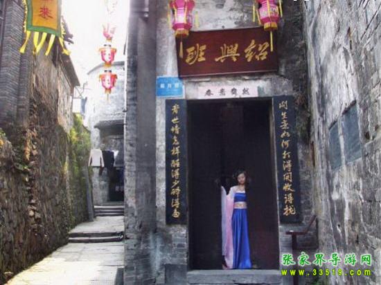 紹興班,位于余家沖,系清代青樓。 始建于清咸豐末年(1860年),是一座四周用封火墻圍護(hù)的木質(zhì)穿斗式的結(jié)構(gòu)建筑,單檐重層,兩進(jìn)三層,各層樓道封閉,分隔有致。各房間置有暗門。具有極其隱蔽的行業(yè)特征。面闊較寬。有濕天井和干天井兩個(gè)。通風(fēng)采光效果較佳。木窗均有雕花,且式樣各異。地面分別用青石板和杉木板鋪就,房間屋面均用洪油漆刷,整體形態(tài)完好。近作局部保護(hù)性維修;增添了相關(guān)實(shí)物布置和表演節(jié)目,對游客開放。