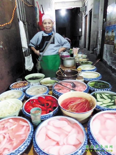 鳳凰本地人介紹好吃的,總是推薦姜糖、獼猴桃等,事實上,當?shù)匦∠锷钐幍呐莶送瑯恿畈簧儆慰唾澆唤^口。酸酸的泡菜可以是豆角,也可以是當?shù)靥赜?的紅心蘿卜、刀豆、包菜、涼薯等,這些都可以成為泡菜原料,每種原料用陶缽盛著擺在架子上。想吃什么,自己用筷子夾了放一起。過完秤,可以根據(jù)自己的喜好 放辣椒粉或白糖拌(辣椒粉還分微辣、猛辣),往旁邊小桌上坐下,邊吃邊看著古街上那些匆匆而過的游客,那種感受絕不亞于在國外街頭喝咖啡賞景。