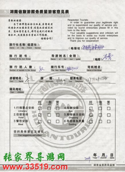 2009年11月11日朱先生一行8人旅游接待質(zhì)量反饋單: