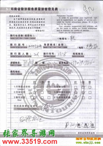 2010年3月23日江西熊先生一行兩位旅游質(zhì)量反饋