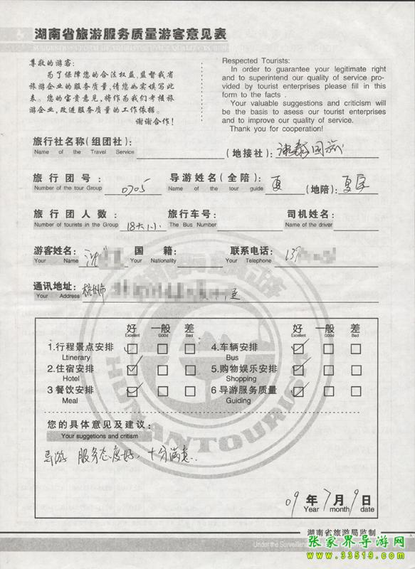 2009年7月5日杭州沈先生一行18人質(zhì)量接待反饋單: