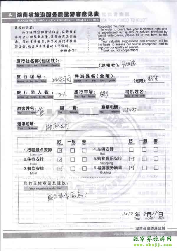 2010年8月29日長(zhǎng)沙黃先生一行2位旅游質(zhì)量反饋:服務(wù)非常滿(mǎn)意